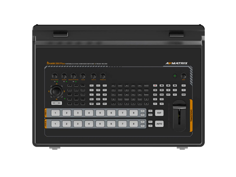 SHARK S8X PLUS, featuring a 17.3-inch FHD IPS switcher, supports 8-ch 3G-SDI and 2-ch 4K HDMI input, with frame synchronization output and an AUX input (supporting video player, UVC, streaming, NDI). Outputs include 2 HDMI, 4 SDI, and 1 HDMI multiview with customizable output source and format option. It supports RTMP(S)/SRT/RTSP/NDI streaming, recording and playback via USB/SD card/2.5-inch SATA, and UVC lossless capture. The switcher offers chroma key, luma key, customizable PIP×3, POP, DSK, and LOGO overlay. For Audio function, it provides two XLR/TRS balanced inputs with 48V phantom power and a 3.5mm stereo input, supporting mixing of 8 embedded video audio channels and two external audio inputs. It also features 8-channel PTZ control with rate, preset, focus control, and manual/auto exposure and color control. The switcher supports macro script functionality for effortless automation of operations a, meeting professional live streaming and production needs.