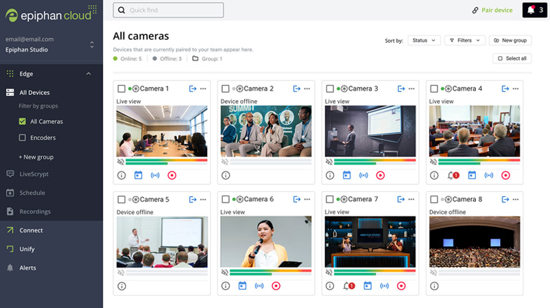 EC20 paired with Epiphan Edge rethinks how cameras are deployed and operated at scale. It’s the first PTZ camera designed to run as part of a cloud-managed fleet, delivering instant, fleet-wide visibility with cloud management built in by design.